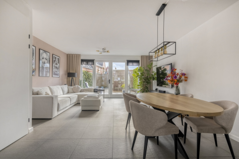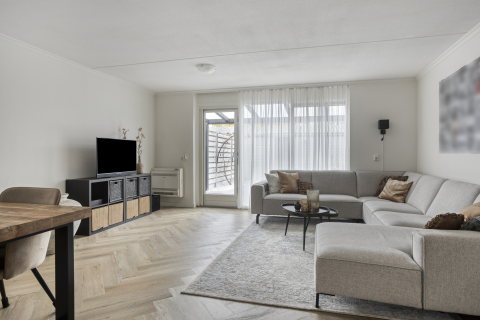 Loop je de woonkamer binnen, dan voel je meteen de ruimte: met een totale oppervlakte van 51,2 m² is dit een leefruimte die volop mogelijkheden biedt. Aan de voorzijde is plek voor een royale zithoek met een grote hoekbank, tv-meubel en eventueel nog een leesstoel. In het midden van de kamer kun je gemakkelijk een grote eettafel plaatsen, maar ook een speelhoek voor kinderen of een werkplek. De vele ramen in de voor- en achtergevel, plus de grote schuifpui en loopdeur naar de tuin, zorgen voor veel lichtinval.